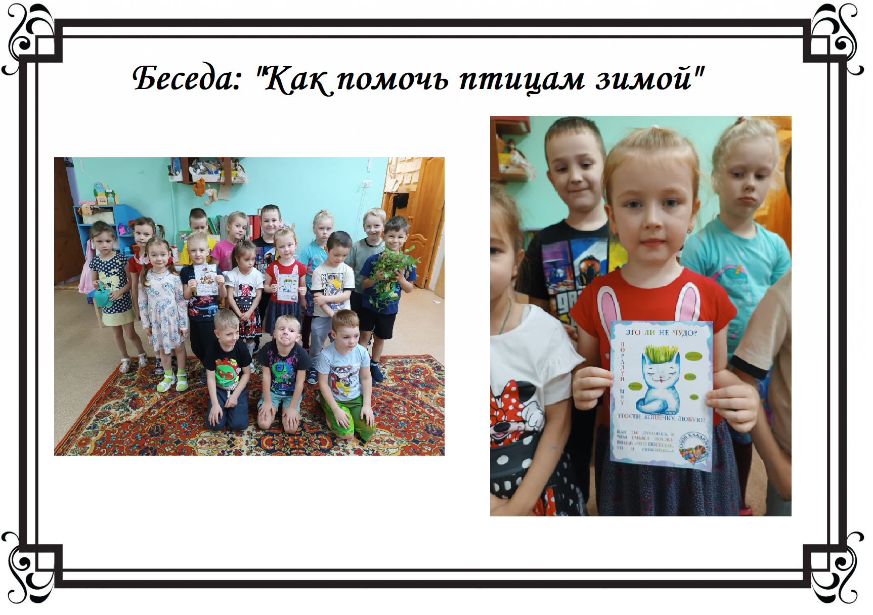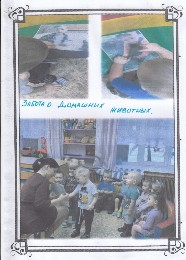 В рамках реализации проекта, дети нашего детского сада развесили кармушки на участках для кормления птиц и забота о птицах. Педагоги провели с детьми беседы: "О ком мы можем позаботиться", "Почему животные нуждаются в заботе", "Как животные и птици готовятся к зиме". Дети смотрели презентацию "Мы в ответе за тех, кого приручили", играли в сюжетно-ролевые игры "Добрый доктор Айболит". В забте о своих бабушках дети пригласили их на праздник "День матери".
