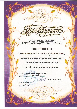 Стаж работы в МБДОУ детский сад № 5 ЗАТО Озерный - 37 лет.